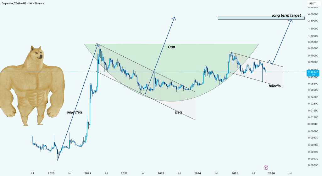 دوجکوین داره یک ساختار واضح جام و دسته بزرگ رو تشکیل میده که چندین سال طول کشیده. بعد از اون رالی قوی «میله و پرچم» که بازار صعودی ۲۰۲۱ رو شروع کرد، قیمت برای چندین سال مشغول گرد کردن یک جام بزرگ بود که نشونه جمعآوری طولانیمدت (accumulation) هست.