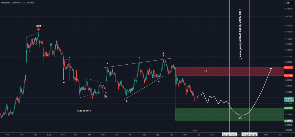 دوج کوین از نقطهای که روی چارت مشخص کردیم وارد فاز اصلاحی شده.