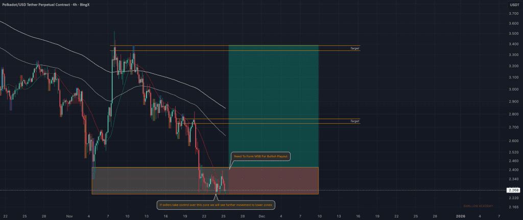 دات (DOT) دقیقاً روی منطقه واکنشش نشسته، جایی که خریدارها دارن سعی میکنن قیمت رو از پایینتر رفتن نگه دارن. فعلاً ساختار هنوز ضعیفه، ولی داریم نگاه میکنیم که قیمت توی این محدوده چطوری رفتار میکنه — اگه خریدارها بتونن این منطقه رو برگردونن و یه تغییر واضح توی مومنتوم نشون بدن، بالاخره سیگنال یه حرکت صعودی رو میگیریم.