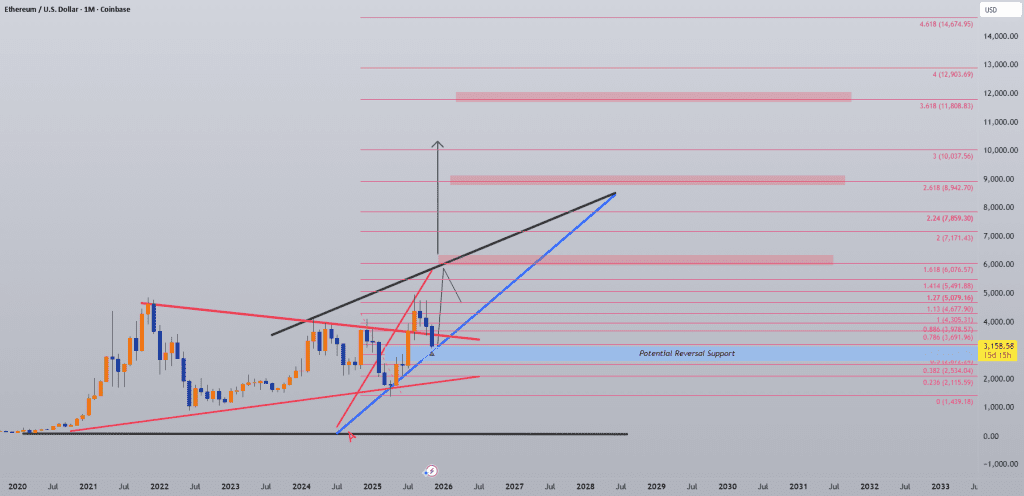 اگه ETH یه کندل ماهانه رو زیر ۲,۵۰۰ دلار ببنده، نشونه یه تغییر مهم تو نقشه راه بلندمدته.