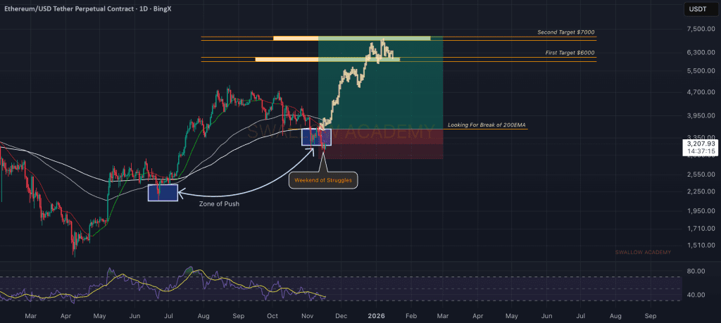 ۳,۲۴۰ دلار ناحیه‌ایه که برای تشکیل MSB بهش نگاه می‌کنیم؛ وقتی این شکست ساختار رو داشته باشیم، هدفمون اینه که به ۲۰۰ EMA برسیم و اون رو بشکنیم. (بعد از اون، آماده یه سری معاملات خرید دیگه خواهیم بود).