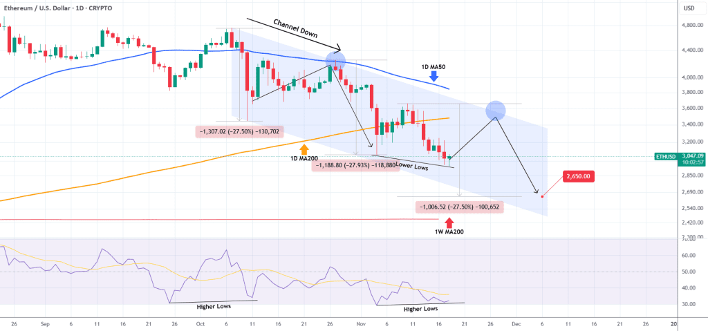 اتریوم (ETHUSD) از تاریخ ۷ اکتبر که اوج قیمتش بوده، تو یک کانال نزولی داشته معامله می‌شده. هر دو پای نزولی (Bearish Leg) اون تا الان ۲۷.۵۰٪ کاهش داشتن.