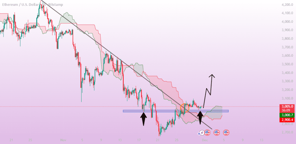 نمودار اتریوم نشون میده که قیمت از خط روند نزولی عبور کرده و داره اطراف یه محدوده کلیدی که روی نمودار مشخص شده، تثبیت میشه. این محدوده قبلا به عنوان یه سطح مهم عمل کرده بود و الان اتریوم داره بالای اون خودش رو حفظ می‌کنه، که نشون‌دهنده قدرت تو ساختار فعلیه. قیمت از طریق ابر هم حمایت میشه، که نشونه تغییر احتمالی تو حرکت بازار (مومنتوم) هست. اگه اتریوم همینطور به حفظ ثبات بالای محدوده مشخص‌شده ادامه بده، حرکت صعودی بعدی ممکنه به سمت سطوح بالاتر گسترش پیدا کنه. هدف اول ۳,۲۲۰ هستش، جایی که واکنش قیمتی مهم بعدی احتمالا اتفاق می‌افته. اگه حرکت صعودی (بولیش مومنتوم) ادامه پیدا کنه، هدف دوم ۳,۳۸۰ هستش، که با ساختار قبلی بازار و حرکت صعودی پیش‌بینی‌شده هماهنگه. حفظ موقعیت بالای ۳,۰۰۰ برای تایید چشم‌انداز صعودی ضروریه.
