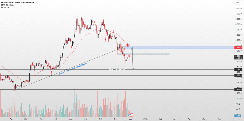 اتریوم حدود ۳۰۰۰ دلار معامله میشه بعد از اینکه خط روند صعودی بلندمدت خودش رو شکست، که نشون دهنده تغییر ساختار بازار هست. قیمت تلاش کرد تا خط روند شکسته شده و EMA 50 روزه (۳۴۱۵ دلار) رو دوباره تست کنه، اما نتونست اون رو پس بگیره و کندلهای رد شدن (rejection wicks) رو در ناحیه هایلایت شده تشکیل داد – یه ریتست نزولی کلاسیک.