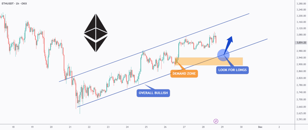 🏹با عقبنشینی قیمت، وقتی ETH منطقه تقاطع خط روند پایینی و ناحیه تقاضا رو دوباره تست کنه، دنبال موقعیتهای خرید میگردیم. این منطقه همپوشانی چندین بار مورد احترام قرار گرفته و برای ورودهای همراه با روند، یه سطح با احتمال بالا به حساب میاد.