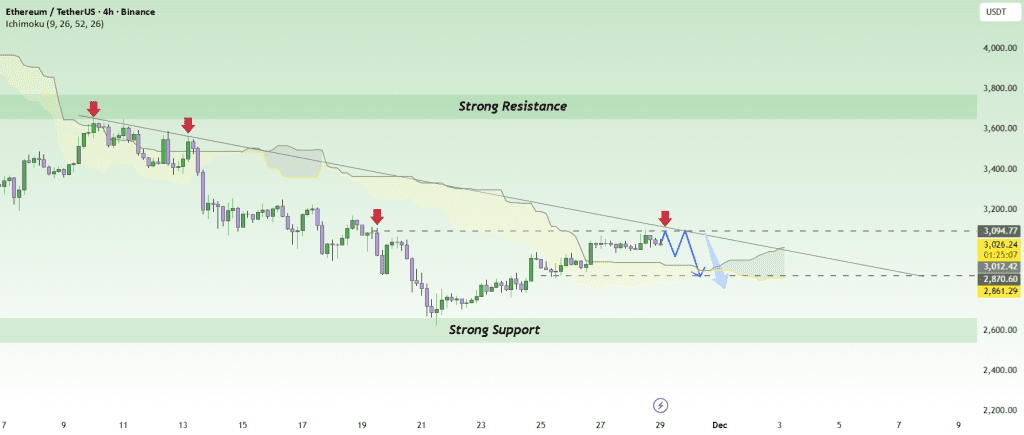 تو روزهای آخر نوامبر، دلار قوی شد و حس ریسکگریزی تو بازار کریپتو پخش شد، که باعث رکود نقدینگی شد. ETH کاتالیزور مثبت خاصی نداشت، و گزارشهای زیادی نشون میداد که قیمت همچنان زیر محدوده ۳۰۰۰–۳۱۰۰ دلار «گیر کرده» – وضعیتی که بیشتر به سمت نزول متمایل میشه تا صعود.