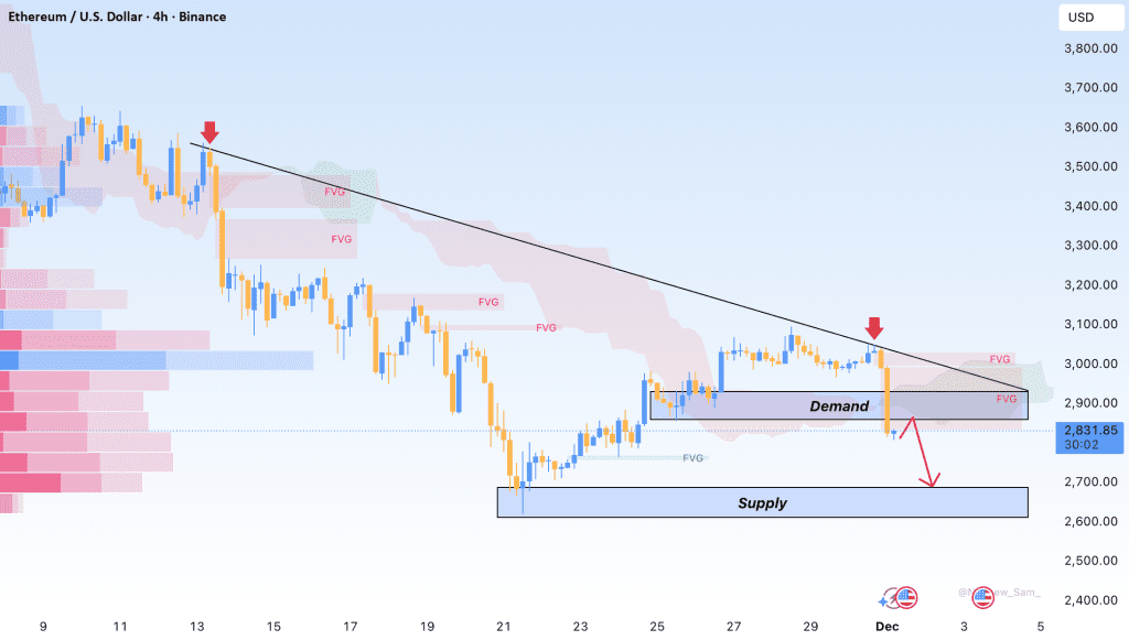 اتریوم به محض اینکه قیمت محدوده عرضه ۳,۰۳۰ تا ۳,۱۰۰ رو دوباره تست کرد، یه کندل نزولی قوی ۴ ساعته زد، این تایید میکنه که فروشندهها هنوز تو این منطقه قوی هستن. دنباله سقفهای پایینتر همچنان پابرجاست و افت شدید زیر ۲,۹۰۰ با حجم معاملات بالا نشونه یه فروش واقعیه، نه یه نوسان معمولی.