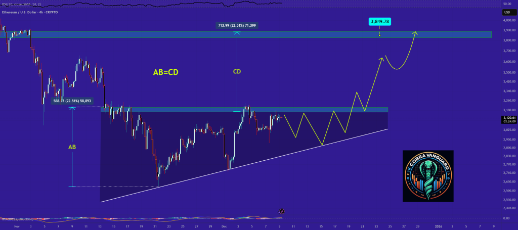 قیمت تو تایم فریم ۴ ساعته تو یه مثلث صعودی قرار داره که می‌تونه امیدوارکننده باشه. اگه قیمت این الگو رو با کندل‌های صعودی بشکنه، می‌تونه راحت به اندازه فاصله AB=CD رشد کنه.