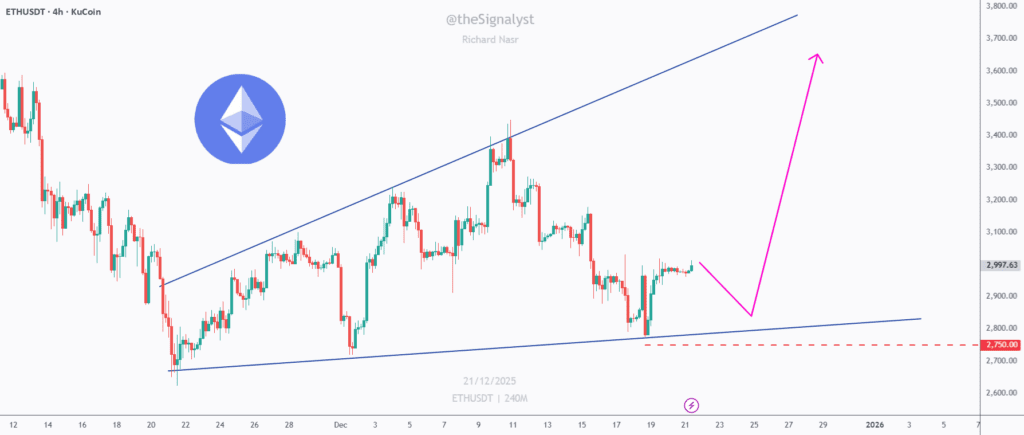 🏹تا وقتی که کنج دستنخورده بمونه، و ETH بالای آخرین کف اصلی یعنی ۲,۷۵۰ دلار خودش رو نگه داره، سناریوی ادامهی صعودی به سمت مرز بالایی کنج، سناریوی محبوبتره.