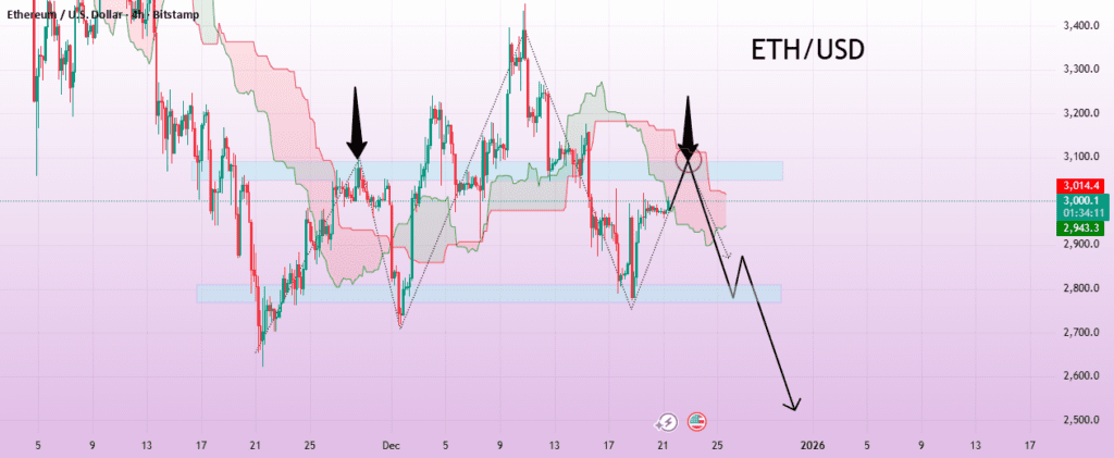 ETH/USD داره فشار نزولی واضحی رو نشون میده، اونم بعد از اینکه بارها نتونست بالای محدوده عرضه مشخص شده حدود ۳,۰۵۰ تا ۳,۱۰۰ دوام بیاره. حرکت قیمت نشوندهنده ساختار سقف پایینتره، بعدش هم یه رد قوی از ابر ایچیموکو داریم که یعنی فروشندهها هنوز کنترل بازار رو دستشون دارن. ابر پیشرو داره نزولی میشه و به عنوان یه فشار پویا عمل میکنه و حرکت صعودی رو محدود میکنه. برگشتهای اخیر بیشتر اصلاحی به نظر میرسن تا حرکتی (impulsive)، که این موضوع تعصب نزولی رو تقویت میکنه. اگه قیمت همچنان به این منطقه مقاومت احترام بذاره، احتمال ضعف بیشتر وجود داره. اولین هدف نزولی نزدیک ۲,۷۸۰ دیده میشه که با یه منطقه تقاضای قبلی همراستاست. یه شکست قاطع زیر این سطح میتونه فشار فروش رو به سمت هدف دوم در ۲,۵۲۴ تسریع کنه که نشوندهنده یه حرکت عمیقتر به سمت حمایتهای پایینتره. مدیریت ریسک مناسب تو شرایط نوسانی توصیه میشه.