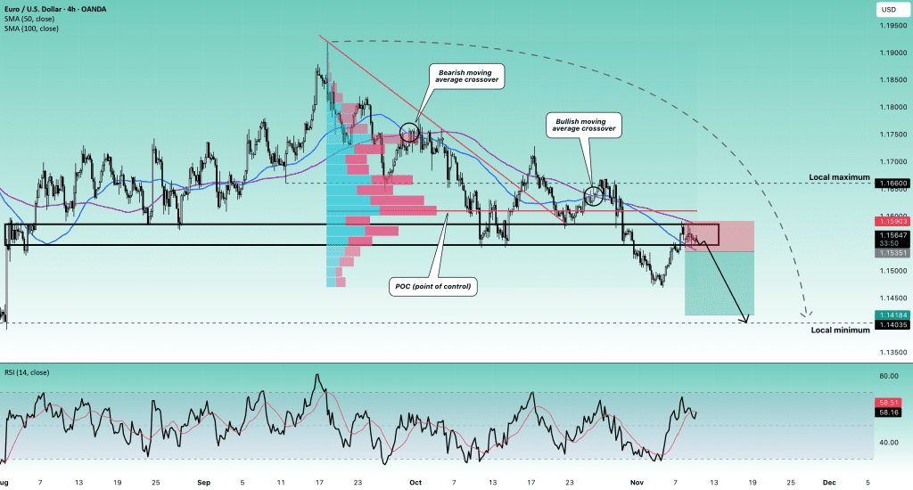 💬 توضیحات: قیمت یورو برگشته به محدوده ۱.۱۵۵۰۰ – ۱.۱۶۰۰۰ که الان داره به عنوان مقاومت عمل میکنه. میشه از این منطقه فعالانه دنبال معاملات فروش بود، مخصوصاً با توجه به حرکت نزولی میانمدت این جفت ارز. تمرکز روی شکستن مرز پایینی ۱.۱۵۵۰۰ و ادامه حرکت به سمت ۱.۱۴۰۰۰ هست.