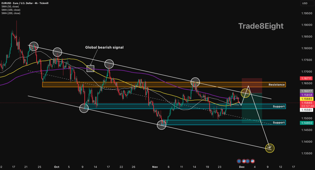 ➡️ نقطه ورود: روی برگشت قیمت از ناحیه مقاومت (حدود ۱.۱۶۰۰ – ۱.۱۶۳۰) بفروشید.