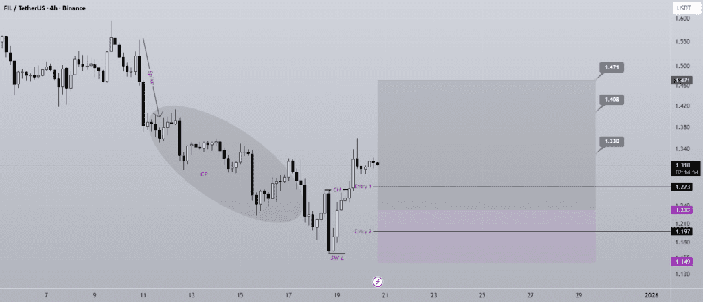 با توجه به CH صعودی، کندل نزولی که در حال پوشش داده شدن هست و تشکیل یک حرکت CP در بالای چارت، فایل کوین ممکنه برای یک حرکت صعودی قوی آماده بشه.