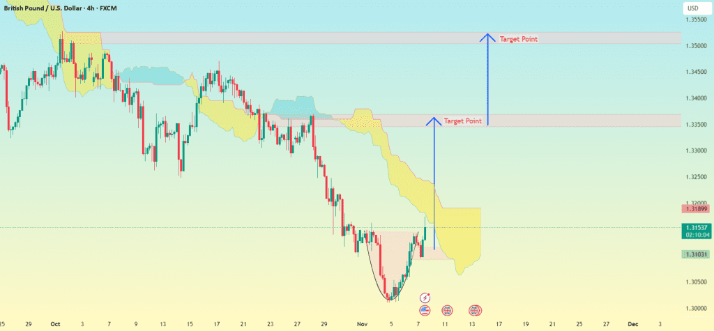 اندیکاتورها: ابر ایچیموکو (ناحیه سایه‌دار زرد)، که نشون میده مقاومت نزدیک ۱.۳۲۵۰–۱.۳۳۰۰ هست.