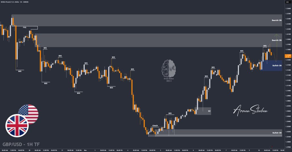 با تحلیل چارت GBP/USD تو تایم فریم ۱ ساعته، میبینیم که بعد از رسیدن به ۱.۳۱۹۰۰، این جفت ارز وارد یه سناریوی صعودی جدید شده و الان حدود ۱.۳۱۷۰۰ معامله میشه.
