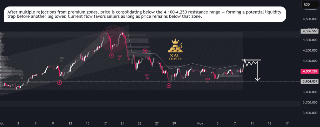 طلا بعد از یه برگشت اصلاحی اخیر، داره نشانه‌هایی از خستگی رو نشون میده. ساختار بازار در تایم ۳ ساعته یه الگوی توزیع واضح رو هایلایت می‌کنه، چون قیمت همچنان داره از ناحیه عرضه ۴۱۰۰–۴۲۵۰ پس زده میشه. شکست‌های مکرر ساختار (BOS) نشون میده که مومنتوم نزولی هنوز غالبه.