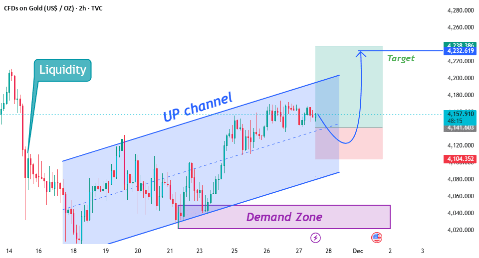 طلا الان داخل یه کانال صعودی مشخص داره حرکت میکنه و مومنتوم صعودی قوی رو نشون میده. قیمت اخیراً از ناحیه تقاضا برگشت خورده که علاقه خریدارا رو تایید میکنه.