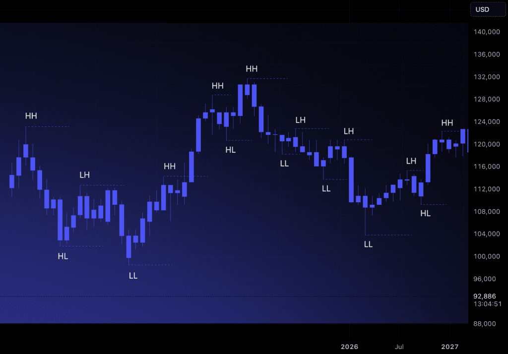 - کف بالاتر (HL): قیمت یه پولبک میزنه اما بالاتر از کف قبلی میمونه، که ادامه روند رو تایید میکنه.