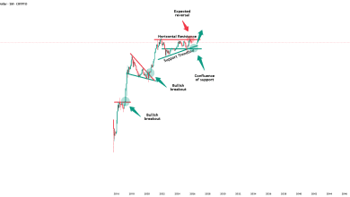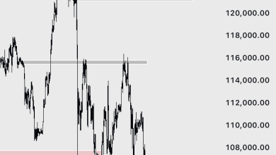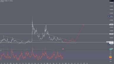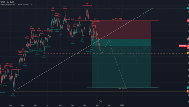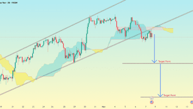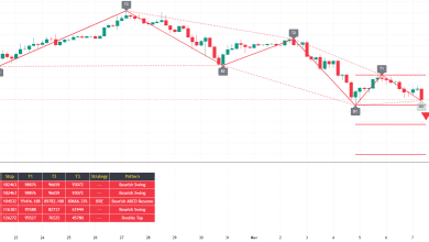 بازار توی روند نزولیه، و ما منتظر سیگنال ورود برای پوزیشن شورت (فروش) هستیم زیر سطح حمایتی ۹۸۷۴۹.۷۷. فقط شکست صعودی ۱۰۴۶۸۵.۲۴ میتونه سناریوی نزولی رو باطل کنه. منبع: تریدینگ--0۰--0۰ -