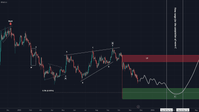دوج کوین از نقطهای که روی چارت مشخص کردیم وارد فاز اصلاحی شده. بر اساس ساختار، یک الگوی ABC روی چارت شناسایی شده و بعد از اینکه موج C تکمیل-- -- ۰-- -- ۰