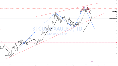 جواب: طلا! نسبت بیت کوین به طلا داره اینجا میشکنه. یه شکست اینجا باعث فروش بیت کوین نسبت به طلا میشه. این یه معامله خیلی ساده، کمریسک و بر اساس-- -- ۰-- -- ۰ -