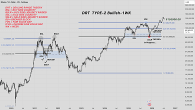 این چارت هفتگی BTCUSD یک مدل صعودی DRT از نوع ۲ رو نشون میده که رفتار ساختاری سمت چپ (۲۰۲۰–۲۰۲۱) رو با ساختار در حال توسعه سمت راست (۲۰۲۴–۲۰۲۵) مقایسه-- -- ۰-- -- ۰ -