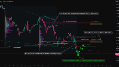 ۱. ساختار روند * خط روند نزولی (خط مقاومت) بالای نمودار هنوز معتبره. * قیمت بارها تو این سطح ریجکت شده، که نشون میده روند نزولی میانمدت هنوز پابرجا هست.--0۰--0۰