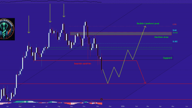 ۱. ساختار روند * خط روند نزولی (خط مقاومت) بالای نمودار هنوز معتبره. * قیمت بارها تو این سطح ریجکت شده، که نشون میده روند نزولی میانمدت هنوز پابرجا هست.--0۰--0۰ -