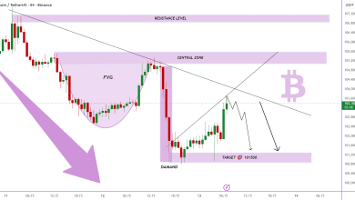 بیت کوین داره یک الگوی نزولی احتمالی رو نشون میده، چون قیمت به سمت ناحیه مقاومت مرکزی نزدیک میشه. رد شدن از این ناحیه میتونه منجر به حرکت نزولی به--0۰--0۰ -