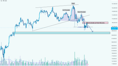 BTC: شکست سر و شانه همسو با شکست کنج صعودی هفتگی