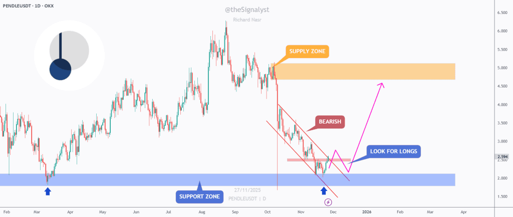 📉پندل هفتههاست نزولی بوده و توی یه کانال نزولی تمیز، داشته افت میکرده. اما قیمت الان داره به یه منطقه حمایتی مهم واکنش نشون میده، همون ناحیهای که اوایل امسال باعث رالیهای قوی قبلی شده بود.