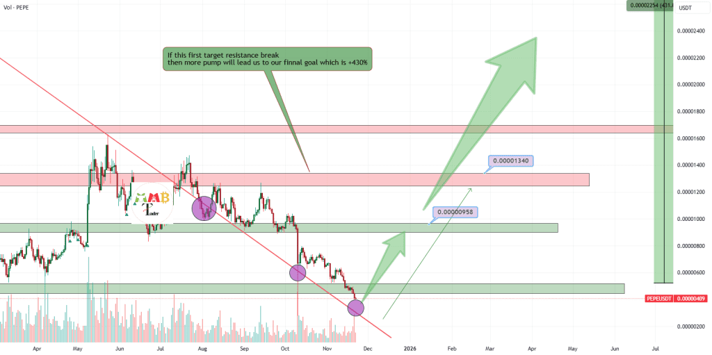 به نظر میاد PEPEUSDT داره فاز نزولیش رو تموم می‌کنه، قیمت یه سطح حمایت روزانه مهم رو شکسته. این دارایی الان داره یه بازآزمایی حساس روی خط روند شکسته انجام میده، که یه پدیده تکنیکال معمولیه که مقاومت قبلی(خط روند قرمز) تبدیل به حمایت میشه. اگه از این سطح با موفقیت پس زده بشه، می‌تونه یه برگشت صعودی قوی رو شروع کنه. با توجه به وسعت نزول قبلی و قدرت این منطقه حمایتی، ما یه حرکت صعودی بالقوه با هدف افزایش تقریباً ۲۰۰% رو بعد از تایید شکست پیش‌بینی می‌کنیم.