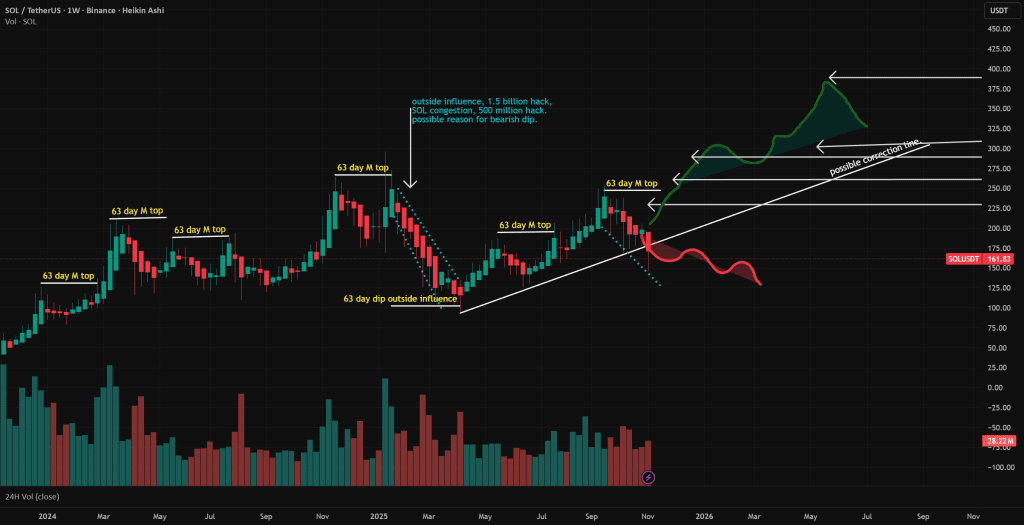 این چارت، ریتم ۶۳ روزه بازار سولانا رو بررسی می‌کنه و یک الگوی ثابت از تشکیل قله‌های “M” شکل رو تقریباً هر ۹ هفته نشون میده. هر چرخه از نظر تاریخی یک اوج محلی داشته که بعدش فاز اصلاحی اومده، این نشون میده که SOL توی یک ساختار مومنتوم قابل تکرار معامله میشه که بین جمع‌آوری و تخلیه نوسان می‌کنه.