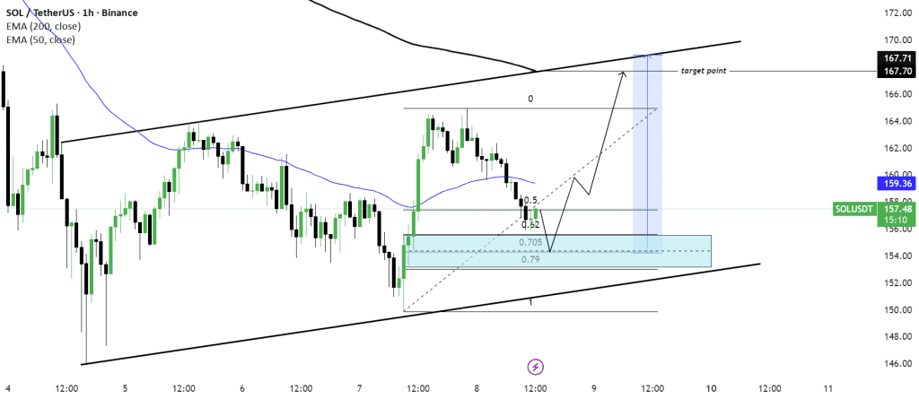 تحلیل تکنیکال SOL/USDT (تایم فریم ۱ ساعته) — حرکت احتمالی برای ادامه روند در یک کانال صعودی.