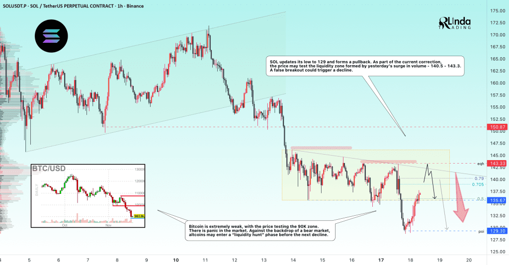 سول داره کفش رو به ۱۲۹ آپدیت می‌کنه و یه پولبک تشکیل می‌ده. به عنوان بخشی از اصلاح فعلی، قیمت ممکنه محدوده نقدینگی رو که از افزایش حجم دیروز – ۱۴۰.۵ – ۱۴۳.۳ – ایجاد شده، تست کنه.
