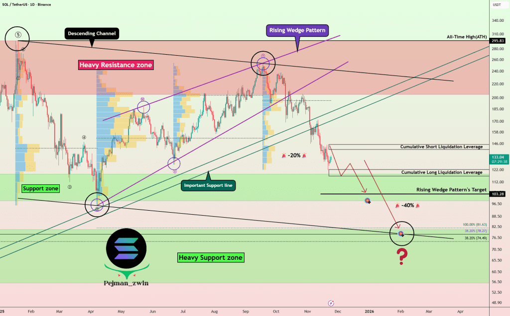 سولانا، با کمک پترن کنج صعودی (Rising Wedge Pattern)، با موفقیت خطوط حمایت مهم خودش رو شکسته و در حال حاضر نزدیک ناحیه حمایت (۱۱۸-۹۸ دلار) حرکت میکنه.
