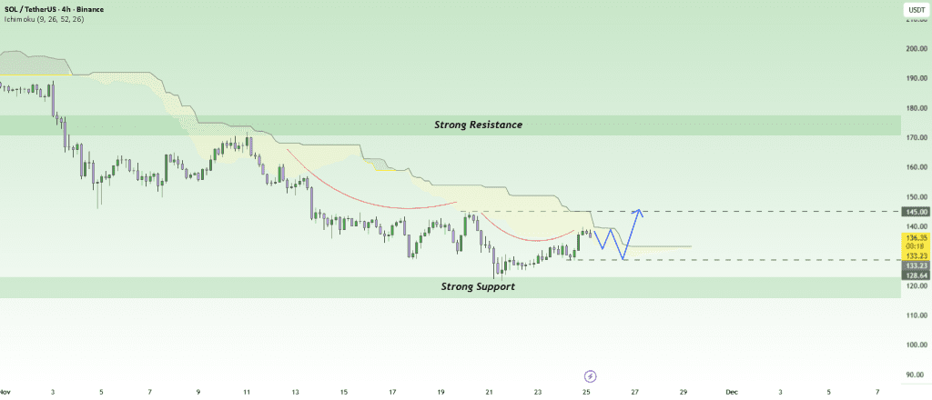 نمودار: در نمودار H4، سول/USDT در حال حاضر در یک کانال صعودی قوی معامله میشه که توسط ابر ایچیموکو در ۱۳۳.۲۳ دلار حمایت میشه. قیمت در ناحیه حمایتی حدود ۱۲۸ دلار قرار داره و اگه بالای این سطح بمونه، پتانسیل یه برگشت قوی وجود داره. اگه سول/USDT این روند رو حفظ کنه، هدف بعدی میتونه ۱۴۵ دلار باشه که در کوتاه مدت مقاومت قویای اونجا هست.