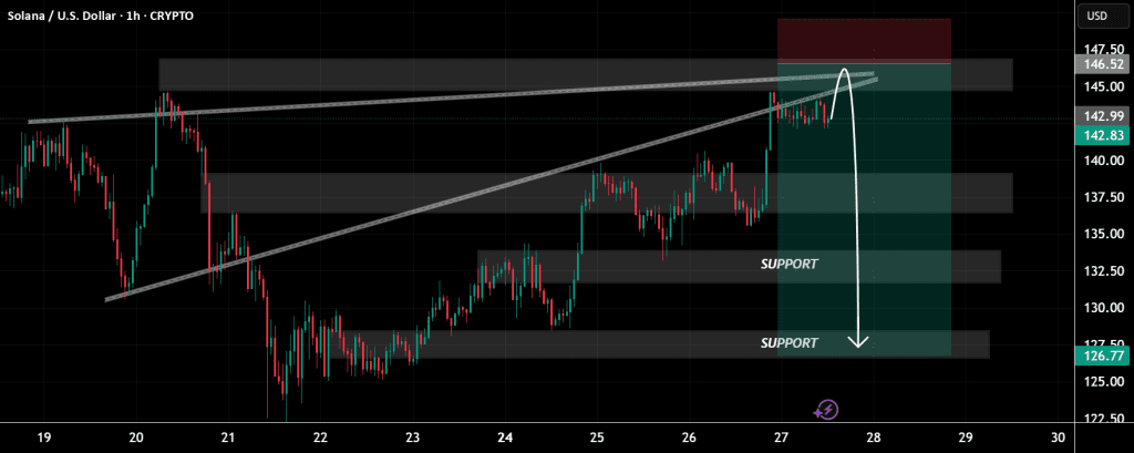 سولانا در برابر دلار آمریکا تو تایمفریم ۱ ساعته، با چندتا عنصر تکنیکال که برای نشون دادن یه الگوی احتمالی برگشت نزولی مشخص شدن.
