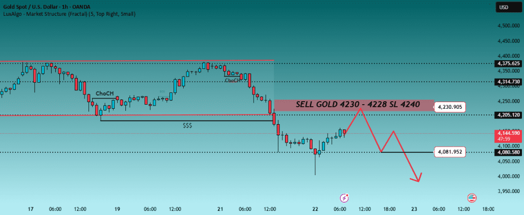 • منطقه پرمیوم (گران): محدوده ۴,۲۳۰–۴,۲۲۸ دلار با یک بلوک سفارش یک‌ساعته (H1) و نقدینگی قبلی همخوانی داره — یک منطقه عالی برای ورود مجدد فروش.