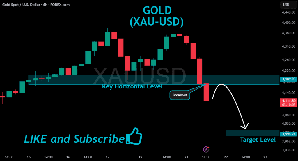 #طلا یک شکست نزولی از سطح افقی مهم ۴۱۸۹.۹۳ داشته.