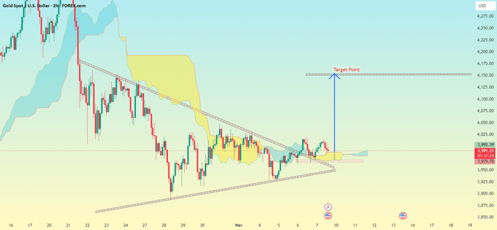 پیش‌بینی هدف صعودی: با ارتفاع کنج که رو به بالا پیش‌بینی شده مطابقت داره → ≈ $۴,۱۷۵.