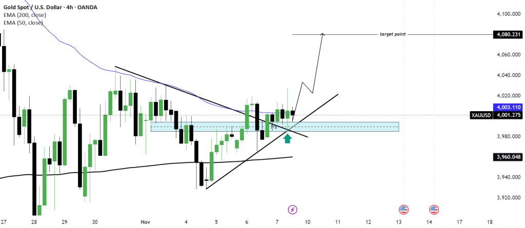 ۵۰ EMA: 4,003.110 → قیمت الان داره این سطح رو تست می‌کنه و شروع به بسته‌شدن بالای اون کرده، که نشون‌دهنده قدرت صعودی دوباره هست.