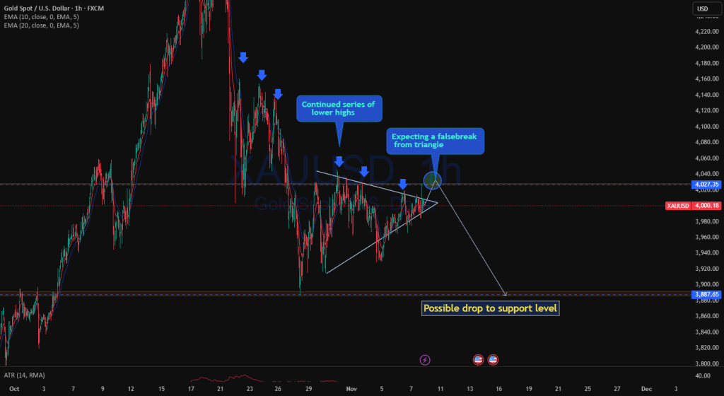 تعطیلی دولت آمریکا روند بلندمدت XAUUSD رو کند کرده و با ۲ هفته حرکت نزولی، بالاخره یه کندل داخلی هفتگی تشکیل شده که کمترین نوسان رو تو ۱۲ هفته گذشته داشته! اما، چون رد شدن نزولی (bearish rejection) وجود داره، با احتمال پایان تعطیلی ممکنه طلا دوباره به سمت حمایت روزانه تا ۳۸۸۵.۰۰ یا پایینتر برگرده؟