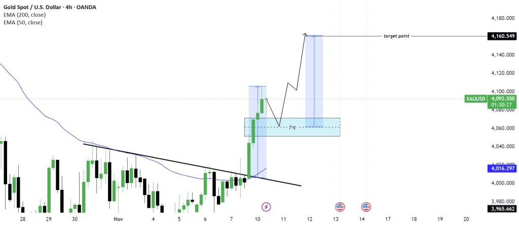 این تحلیل میگه که طلا بعد از یه پولبک کوتاهمدت احتمالی، قراره حرکت صعودی خودش رو ادامه بده. چارت نشون میده قیمت به سمت نقطه هدف ۴,۱۶۰.۵۴۹ حرکت میکنه.