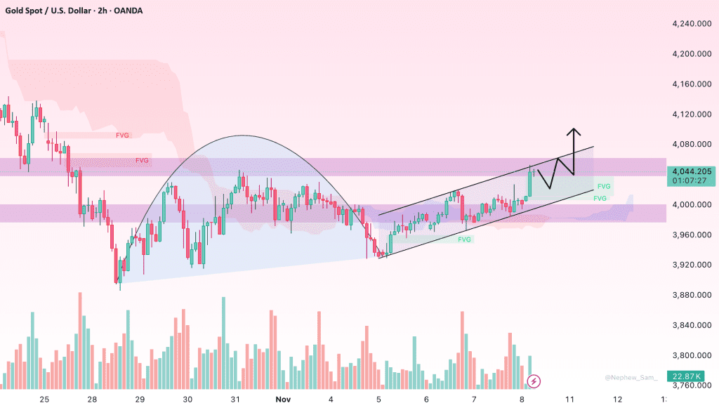 شکاف ارزش منصفانه (FVG) بین ۳,۹۸۰ تا ۴,۰۲۰ دلار پر شده، و طبق رفتار پرایس اکشن، طلا معمولاً یه پولبک کوچیک به سمت عرضه میزنه تا اون رو دوباره تست کنه، قبل از اینکه موج صعودی بعدی رو تشکیل بده. در کوتاهمدت، انتظار دارم قیمتها ممکنه دوباره به ۴,۰۲۰ تا ۴,۰۰۰ دلار برگردن، قبل از اینکه به سمت ۴,۰۸۵ تا ۴,۱۰۰ دلار برگردن بالا.