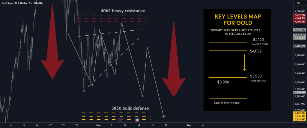 🧭 سوگیری هفته آینده: فروش کوتاه در محدوده $۴,۰۴۰–$۴,۱۲۰؛ حد سود اول $۳,۹۵۰ و بعد $۳,۸۵۰ (برنامه شما). با برگشت پایدار بالای $۴,۱۲۰–$۴,۱۷۵ این سناریو باطل میشه؛ از دست دادن $۳,۸۵۰ ریسک گسترش نزول رو داره.