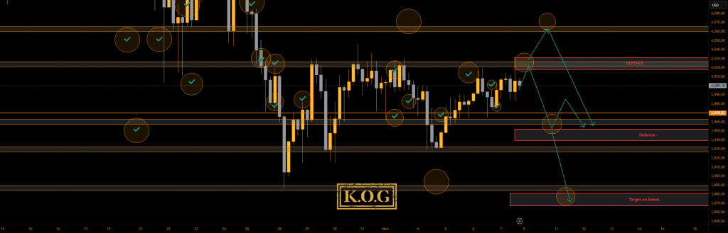 احتمال داره این رِنج تو نیمه اول هفته ادامه پیدا کنه، با مقاومت فوری بالای سر، تو محدوده ۴۰۰۶-۱۰ که باید بشکنه تا بتونیم سطح ۴۰۳۰ رو هدف قرار بدیم، که همون چیزیه که دنبالشیم. برای اینکه این اتفاق بیفته، حمایت ۳۹۹۰ باید ما رو نگه داره و اگه بتونیم به سمت بالا حرکت کنیم، اون سطح ۴۰۳۰ همونیه که باید حواسمون بهش باشه. رد شدن از اونجا می‌تونه دوباره به یه حرکت نزولی به سمت پایین‌تر منجر بشه، اما باید اون باکس قرمز پایین رو تو ذهنمون داشته باشیم. اون سطح دفاعی اصلی برای اوایل هفته‌ست و باید بشکنه!