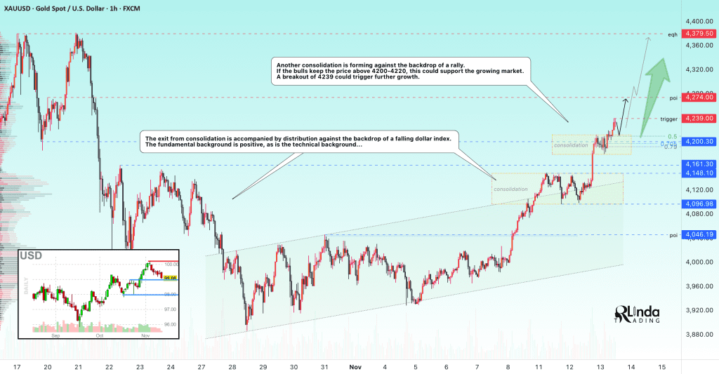 طلا هنوز پتانسیل رشدش رو داره. سطح ۴۲۰۰ دلار یه مانع مهمه، و قیمت وارد یه محدوده معاملاتی جدید ۴۲۰۰-۴۴۰۰ شده. اگه داده‌ها ضعیف باشن یا فدرال رزرو کاهش نرخ بهره رو تو دسامبر تایید کنه، احتمال شکستن (عبور از) محرک محلی وجود داره…