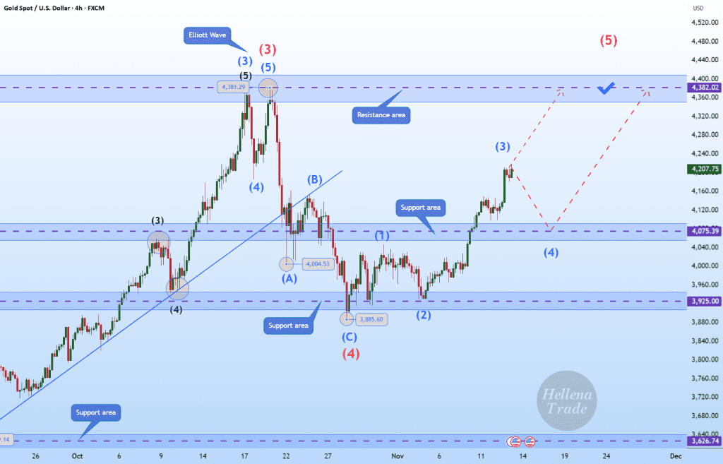 هلنا | طلا (4H): لانگ (خرید) تا محدوده مقاومتی 4382.