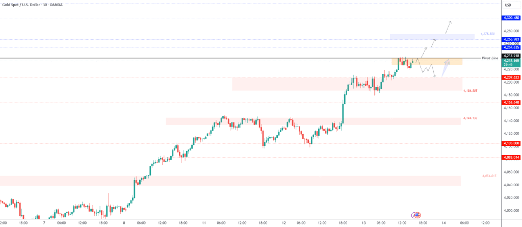 طلا همچنان روند صعودی داره، اما برای تایید حرکت صعودی بعدی به سمت ۴۲۵۴، ۴۲۶۷ و ۴۳۰۰، به بسته شدن کندل ۱ ساعته واضح بالای ۴۲۳۸ نیاز هست.
